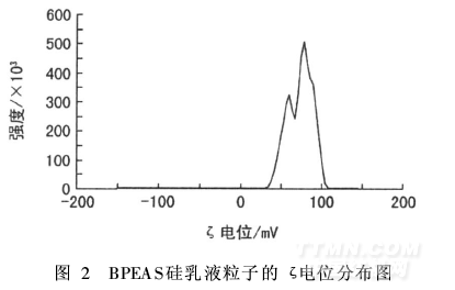 用去離子水稀釋BPEAS硅乳液至含固量為1. 0%,用納米粒度儀及Zeta電位分析儀測(cè)定粒徑分布及ζ電位。