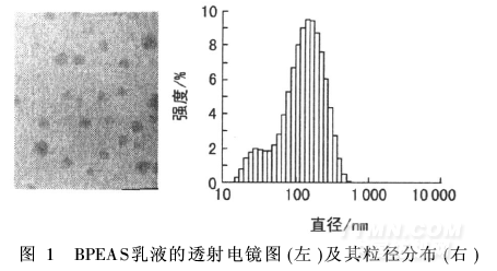 用去離子水稀釋BPEAS硅乳液至含固量為0. 1%,經(jīng)0. 5%磷鎢酸染色后,用H-600型透射電子顯微鏡觀察、拍照。