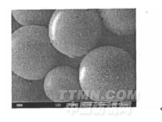 電鏡照片中,復(fù)合微球呈圓球形,粒徑均勻,表面光滑,平均粒徑在20μm左右。