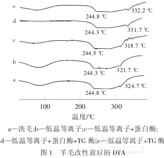 選擇洗毛布,對低溫等離子、蛋白酶和TG 酶處理的布樣進(jìn)行DTA 熱性能分析,結(jié)果如圖1 所示.