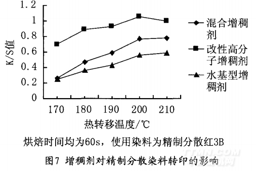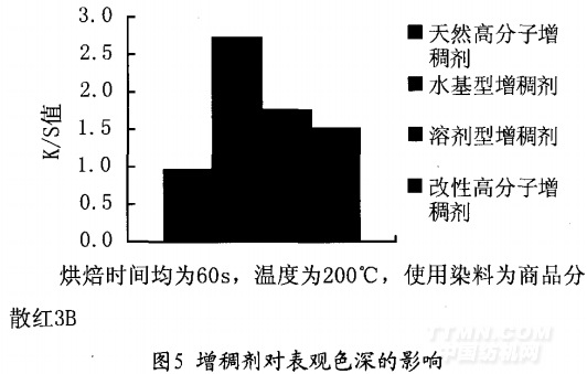深,使用水基型增稠劑得色最淺,且混合增稠劑和水基型增稠劑得色隨溫度升高增加的比改性高分子增稠劑增加的要多,色深受溫度影響大,而改性高分子增稠劑得色受溫度影響小,從而得出精制染料以改性高分子增稠劑制作印墨深色效果最為優(yōu)越。