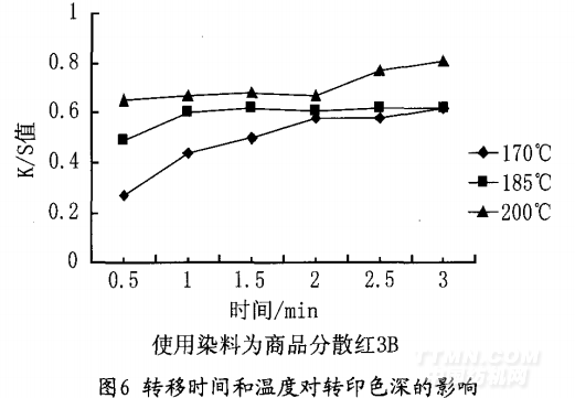 從圖6可以看出熱轉(zhuǎn)印溫度對轉(zhuǎn)印色深的影響顯 著,溫度越高,熱轉(zhuǎn)印時間越長,上染率越高,但 隨著時問的延長,再增加壓燙時間,上染率增加趨 緩。這是因為在熱轉(zhuǎn)印過程中,隨著時間的延長, 纖維上與熱轉(zhuǎn)印紙上的染料濃度差逐漸減小,上染 速率也隨之減小,并最后達到平衡 。由此可以說 明,熱轉(zhuǎn)印紙與織物問的染料濃度差是分散染料從 熱轉(zhuǎn)印紙上轉(zhuǎn)移到織物上的推動力,濃度差越大, 推動力越大 ,表觀色深K/S值越大。由圖還可看出 以170℃下處理2min,185℃下處理lmin以及200℃下 處理0.5min為分界點,之后的K/S值增長緩慢,這是 由于升溫和延長時間都是提高K/S值的方法,溫度 越高,K/S值達到相對穩(wěn)定值所用的時間就越短。 而200℃下處理2.5min時,K/S值再次發(fā)生大幅度增長,這是因為合成纖維有著特有的性能,如玻璃化 溫度比較明確的一類,像滌綸,它的無定形區(qū)存在 著1~10nm的微小空隙,當溫度上升~U200℃時,無 定形區(qū)內(nèi)分子運動劇烈,逐漸軟化成半熔融狀態(tài), 即所謂液層(Liquid Layer)。由于范德華力的作用, 受熱成氣態(tài)的分散染料分子能夠運轉(zhuǎn)到滌綸周圍, 然后擴散進入無定形區(qū),達到著色目的 ,2.5min應(yīng) 為纖維達到半熔融狀態(tài)所需的時間。