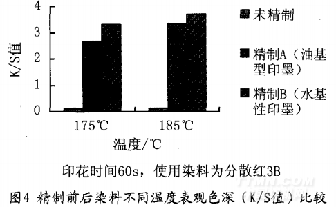 由柱形圖可看出,精制后的染料制成的不同類型的印墨,表觀色深都明顯大于商品分散染料,精 制后的染料在制作印墨上占有優(yōu)勢。而且隨著溫度 的增加,精制染料的表觀色深值有較明顯的增大,而商品染料隨溫度的變化卻無明顯變化。故在后期生產(chǎn)中,精制染料通過改變工藝參數(shù)還可能獲得更 高的色深值。