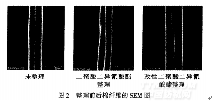 由圖2可知,棉纖維經(jīng)整理后,在表面形成一層致密且較均勻的膜,該膜包裹在纖維表面,賦予纖維良好的拒水性,同時(shí)使得纖維之間的摩擦系數(shù)下降,可獲得柔軟、豐滿的手感.但二聚酸二異氰酸酯及改性二聚酸二異氰酸酯整理后纖維表面形成的單分子膜不會(huì)改變被整理纖維的表面形貌.