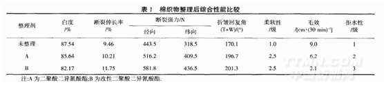 (2)經(jīng)改性二聚酸二異氰酸酯乳液處理后,棉織物的強(qiáng)力有了明顯的提高.手感提高到2.5級(jí),拒水性能提高到3級(jí),但白度和毛效有所下降.
