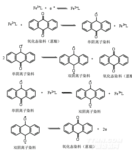 在可逆的電化學(xué)工藝中,第一步還原反應(yīng)是Fe3+絡(luò)合物在陰極表面獲得一個(gè)電子,被還原成Fe2+絡(luò)合物;被還原的Fe2+絡(luò)合物從陰極擴(kuò)散到染料粒子表面,在粒子表面發(fā)生電荷轉(zhuǎn)移(包括單電子轉(zhuǎn)移),形成單陰離子染料,這是形成被完全還原的雙陰離子染料的中間步驟。有二種途徑可形成被完全還原的雙陰離子染料。對(duì)大多數(shù)染料來說,每還原一個(gè)染料需要二個(gè)電子,二個(gè)單陰離子染料可生成一個(gè)完全被還原的雙陰離子染料,并重新生成一分子氧化態(tài)染料。形成雙陰離子染料分子的另一個(gè)反應(yīng)機(jī)理可能是:首先發(fā)生單電子轉(zhuǎn)移,形成單陰離子染料分子,然后單陰離子染料被還原形成雙陰離子染料分子。