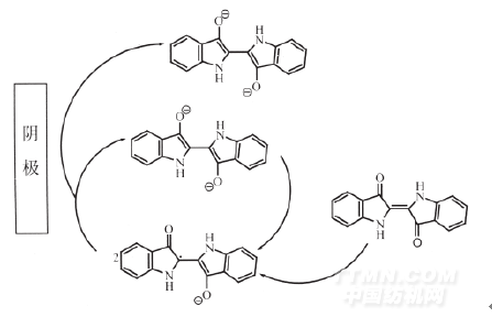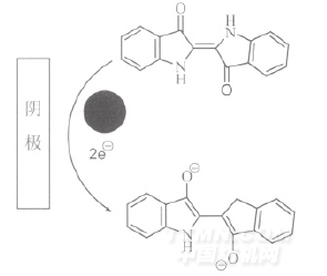 Albert Roessler直接采用靛藍(lán)作為電子載體進(jìn)行靛藍(lán)染料的電化學(xué)還原。染色開始時(shí),先采用少量的保險(xiǎn)粉對(duì)部分染料進(jìn)行還原,生成染料隱色體,然后在電化學(xué)的作用下,懸浮在溶液中的染料顆粒與染料隱色體作用,生成一種介于染料本身和染料隱色體之間的離子自由基。離子自由基的還原相對(duì)容易,反應(yīng)產(chǎn)物在實(shí)驗(yàn)條件下比較穩(wěn)定。在離子自由基的作用下,電化學(xué)還原過程自發(fā)進(jìn)行,整個(gè)反應(yīng)過程如下: