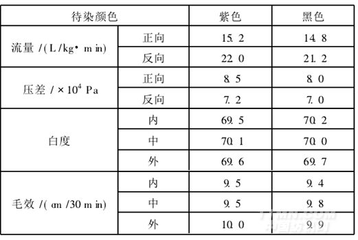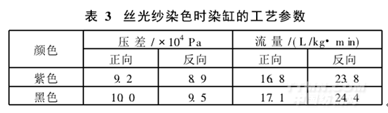 染色過程中,一般先將染料在化料桶中攪拌均勻后再加入料缸。對于翠藍(lán)類大分子染料,加入化料缸前可采用濾網(wǎng)進(jìn)行過濾。無機(jī)鹽采用染缸循環(huán)水由快到慢添加鹽。加工紫色時,采用90%的加堿功率;加工黑色時,采用50%的加堿功率。染缸的功率設(shè)定為85%,正反循環(huán)時間分別為6 min和4 min。染缸的流量和壓差見表3。