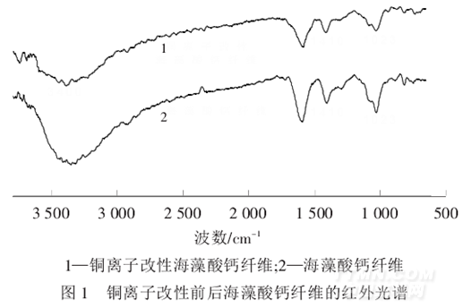 銅離子改性前后海藻酸鈣纖維的紅外光譜見圖1.