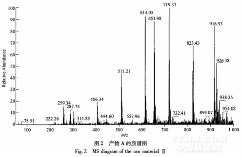 以4-枯基酚和苯乙烯為原料,酸性催化劑催化,在90℃下生成酚類產(chǎn)物,圖l為酚類產(chǎn)物的質(zhì)譜圖,從圖中可以看出,產(chǎn)物是數(shù)均分子量在1600HN以下的系列混合物,且低分子的響應(yīng)信號比較強烈,說明酚類產(chǎn)物里含有未反應(yīng)的原料、低分子的聚合物和較高相對分子質(zhì)量的聚合物.酚類產(chǎn)物作為分散劑中的親油基團,如果相對分子質(zhì)量太小,會直接影響分散劑的親油性,因此,在進行下一步反應(yīng)前,將酚類產(chǎn)物堿洗2遍,水洗10遍,用以除去其中的低分子部分,作為產(chǎn)物A.圖2為產(chǎn)物A的質(zhì)譜圖,從圖看出相對分子質(zhì)量在500以下的響應(yīng)信號很弱,說明低分子物質(zhì)基本不存在了,可以用來作下一步反應(yīng)的原料.