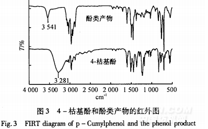 圖3為4-枯基酚和反應(yīng)后的酚類產(chǎn)物的紅外譜圖.圖3顯示,3281cm-1處有一強吸收峰,該峰為4-枯基酚中的0-H伸縮振動吸收峰,反應(yīng)后該O-H峰變?yōu)?541cm-1,這是由于4-枯基酚接上苯乙烯后,基團的誘導效應(yīng)和共軛效應(yīng)導致羥基吸收頻率發(fā)生位移,從而也證明了4-枯基酚已接上苯乙烯[6].