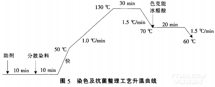 染色工藝流程:裝鍋一去油(去油劑ZS一100為1 g/L,98 ºC,20 min)一熱水洗(80℃,20 min)----溢流水洗(10 min) 染色及抗菌整理、還原清洗一熱水洗(60℃,l0min) 溢流水洗(10 min,pH值6.5~7.0)一親水性柔軟整理(親水性柔軟劑DT一6400為2~3 g/L,40