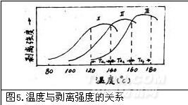 壓燙溫度對(duì)剝離強(qiáng)度影響很大,圖5是在一定的壓力和時(shí)間下,三種不同襯布的壓燙溫度與剝離強(qiáng)度的關(guān)系。