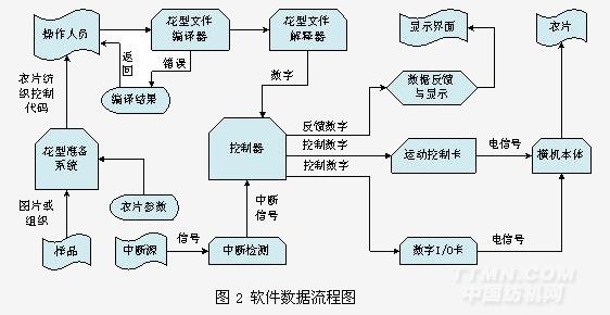 圖2所示為軟件數(shù)據(jù)流程圖,由此可以看出數(shù)據(jù)在電腦橫機(jī)運(yùn)行中的流向。其具體過程如下:花型準(zhǔn)備系統(tǒng)根據(jù)衣片樣品的圖案,按照衣片的參數(shù)生成衣片控制代碼?;ㄐ臀募幾g器對(duì)操作人員輸入的花型文件進(jìn)行編譯,花型文件解釋器是經(jīng)過對(duì)編譯的文件進(jìn)行解釋,將其轉(zhuǎn)化成為可以用于控制的數(shù)據(jù),并對(duì)數(shù)據(jù)進(jìn)行存儲(chǔ)和管理??刂破魍ㄟ^這些數(shù)據(jù)對(duì)數(shù)字I/O卡和運(yùn)動(dòng)控制卡進(jìn)行控制。數(shù)字I/O卡和運(yùn)動(dòng)控制卡通過取得的弱電信號(hào)控制強(qiáng)電信號(hào),直接控制橫機(jī)本體。反饋的數(shù)據(jù)和衣片信息會(huì)通過操作界面反饋給操作人員。橫機(jī)本體在受控狀態(tài)下編織衣片。