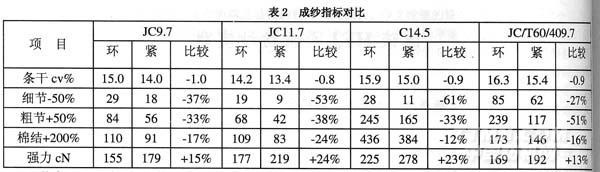從表l、2比較結(jié)果看,毛羽減少50%~60%,強力提高15%~25%。同時可改善成紗條干,減少細節(jié)、粗節(jié)、棉結(jié),改善紗線外觀。還能適當(dāng)提高紡紗速度。