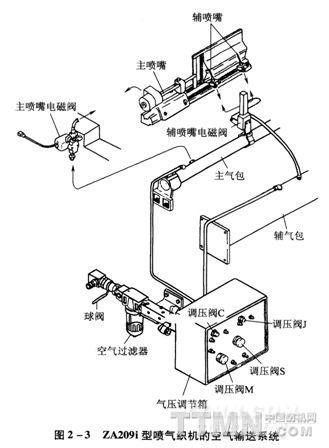噴氣織機的空氣輸送系統(tǒng)是由空氣壓縮機出來的壓縮空氣,經(jīng)過配管到達織機上的空氣過濾器,過濾后的空氣經(jīng)過氣壓調(diào)節(jié)箱內(nèi)的調(diào)壓閥調(diào)節(jié)壓力后,分送到噴射裝置的各執(zhí)行器件。圖2—3為ZA209i型噴氣織機的空氣輸送系統(tǒng)。