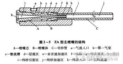 新型噴氣織機(jī)為了實(shí)現(xiàn)高速時(shí)的穩(wěn)定引緯,加裝了輔助主噴嘴,輔助主噴嘴與主噴嘴構(gòu)成串聯(lián)組合關(guān)系,可以縮短緯紗加速時(shí)間,從而為噴氣織機(jī)提高運(yùn)行速度或拓寬筘幅創(chuàng)造了條件。2A型主噴嘴的結(jié)構(gòu)見(jiàn)圖2—5。