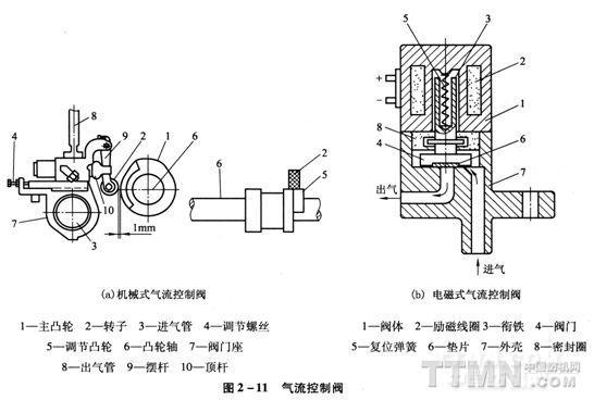 (1)機(jī)械式氣流控制閥[圖2一ll(a)]:最早用在噴氣織機(jī)上的氣流控制閥是機(jī)械閥,靠凸輪來完成氣流控制閥的開閉,沒有自調(diào)功能,調(diào)整不方便且易磨損、壽命短,目前在噴氣織機(jī)上已很少使用。