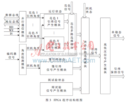 FPGA程序結(jié)構(gòu)框圖如圖3所示,其子模塊有:織機(jī)角度檢測模塊、并行通信接口模塊、引緯信號產(chǎn)生模塊、多路選擇模塊、高低壓驅(qū)動(dòng)信號產(chǎn)生模塊等。