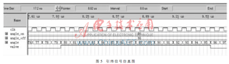 FPGA本質上是由硬件組成的,其編程語言也為VHDL等硬件描述語言,它的程序并行執(zhí)行,也就是說一旦主機角度或設定的打開關閉角度有變化,幾十路的引緯信號就會立即同時輸出,誤差僅為信號的建立時間,只有幾納秒。因此FPGA產(chǎn)生的引緯信號可以很好地滿足噴氣織機對引緯控制精度和控制一致性的要求,從根本上改變處理器產(chǎn)生引緯信號的弊端。引緯信號仿真圖如圖5所示:設定打開角度為80°,設定關閉角度為96°,引緯信號在這個區(qū)間內有效。由圖5可以看出,引緯信號的產(chǎn)生和關閉幾乎沒有任何延時。