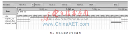 在FPGA中雖然沒有單穩(wěn)態(tài)電路,但是可以采用時鐘計數(shù)的方式來模擬單穩(wěn)態(tài)的產(chǎn)生:在信號的上升沿開始計數(shù)并設置單穩(wěn)態(tài)信號有效,計滿8ms的時鐘脈沖個數(shù)后停止計數(shù)并設置單穩(wěn)態(tài)信號無效,這樣就可以輸出精確的8ms單穩(wěn)態(tài)信號。例如,假設采用8k的計數(shù)時鐘頻率,64個計數(shù)時鐘周期就是8ms,單穩(wěn)態(tài)信號的誤差不會超過0.125ms,高低壓驅動信號仿真圖如圖6所示,其中signal_8ms為8ms單穩(wěn)態(tài)驅動信號,signal_hold為低壓驅動信號。