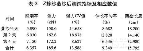 具體工藝優(yōu)選試驗(yàn)如下:蒸紗工藝參數(shù):抽真空8min,達(dá)到指定真空度0.08MPa,溫度95~110℃,高溫高壓蒸紗J20min,蒸紗后取紗樣測(cè)試數(shù)據(jù)見(jiàn)表2和表3。