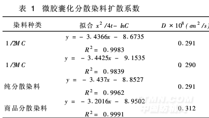 由表1可看出它們的擴(kuò)散系數(shù)無(wú)數(shù)量級(jí)差異,這可能是由于染料在纖維內(nèi)部的擴(kuò)散主要與分散染料分子本身的化學(xué)性質(zhì),與染料跟纖維之間的作用力有關(guān),分散染料微膠囊囊壁及助劑的存在并不改變?nèi)玖戏肿拥男再|(zhì),故不影響染料在薄膜內(nèi)部的擴(kuò)散。