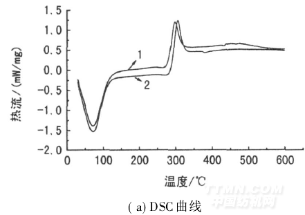 從圖4可看出,在相同條件下,未改性殼聚糖纖維的熱失重從112. 7℃就已開始, 264. 1℃已產(chǎn)生明顯的熱分解,當溫度升到300℃左右,質量損失急速增加,質量損失率約為49. 98%; 237. 1~458. 1℃為主要的裂解階段—殼聚糖纖維鏈裂解反應。與此相比,改性纖維的熱失重從118. 3℃開始, 286. 8℃迅速下降。286. 8~451. 1℃為主要的裂解階段,質量損失增加最大,此階段質量損失率約為48. 2%。比較圖4(a)和(b)可知,未改性殼聚糖纖維的初始失重溫度和最大熱失重速率溫度均比改性纖維要低,表明改性纖維的熱降解滯后于未改性殼聚糖纖維。這是因為硅偶聯(lián)劑、納米SiO2與殼聚糖纖維之間交聯(lián)網(wǎng)絡阻止了殼聚糖分子鏈的運動,要使殼聚糖纖維分子鏈在加熱過程中斷裂則需要較高的溫度。這也說明殼聚糖纖維聚合物鏈對SiO2納米顆粒的包覆作用主要是通過共價鍵,而不是氫鍵。正是由于這種包覆作用,改性纖維的熱穩(wěn)定性較未改性殼聚糖纖維有較明顯提高。