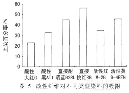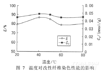 從圖6可以看出,直接桃紅12B上染百分率隨著染料質(zhì)量分?jǐn)?shù)的增加而下降,而上染量增加。直接桃紅12B在質(zhì)量分?jǐn)?shù)不大于4%時,上染率較高。因為改性纖維上存在可供染料定位吸附的位置,當(dāng)染料質(zhì)量分?jǐn)?shù)較低時,染料可以充分上染即占據(jù)染座;當(dāng)染料質(zhì)量分?jǐn)?shù)較高時,相對而言纖維上可吸附的位置減少,上染百分率降低,而纖維上吸附染料量仍呈增加趨勢。綜合考慮,選用染料質(zhì)量分?jǐn)?shù)4% (omf)較好。