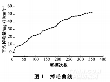 2.1掉毛曲線與掉毛速率曲線 有研究表明,摩擦次數(shù)對織物的掉毛量有很大 影響,而掉毛曲線對摩擦次數(shù)的確定有很大幫 助 。機器每摩擦10次稱量1次織物磨毛后的 減量,以摩擦次數(shù)為x軸,掉毛量為Y軸進行作圖, 結(jié)果如圖1所示。圖1表明:兔毛織物的掉毛量隨 著摩擦次數(shù)增加也相應(yīng)的增加,當(dāng)摩擦次數(shù)達到 300次左右時,曲線斜率已變的很小,掉毛量基本趨 于穩(wěn)定。