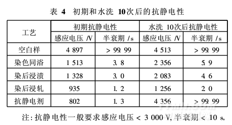 而且具有較好的耐洗性。其中,采用染后浸軋法效果最優(yōu)(表4)。TF-620與抗靜電劑相比具有以下優(yōu)點(diǎn):