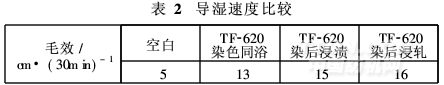 滌綸的吸濕性和導(dǎo)濕速度都較差,當(dāng)人體出汗時,很難將汗液及時排出,感覺發(fā)悶。而采用吸濕排汗劑,無論是采用染色同浴、染后浸漬或染后浸軋法,都具有優(yōu)異的吸濕性和導(dǎo)濕性(表2)。