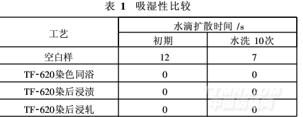 經(jīng)吸濕排汗劑TF-620整理后,滌綸織物上的水分散發(fā)明顯加快,它是通過提高織物的吸濕性和導(dǎo)濕速度獲得的。其中,染后浸漬或染后浸軋法效果更佳(圖1)。