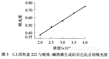 從圖5可知,C.I.活性藍222染料中均三嗪基上的活潑氯與吡啶一堿溶液反應生成的有色化合物,其吸光度與染料濃度(鹵代雜環(huán)上的活潑氯濃度)有很好的線性關系(相關系數(shù)尺:0.9972),因此可以對某些活性染料的水解過程進行定量分析.