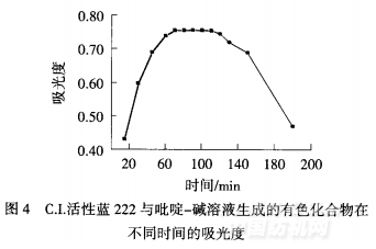 比色法中生成相對穩(wěn)定的有色化合物需要一定條件,且活性基不同,反應條件有所變化.[1]554對C.I.活性藍222與吡啶一堿溶液在50℃下反應不同時間后