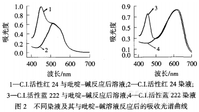 對一氯均三嗪活性染料(C.I.活性紅24)[3]和異雙活性基活性染料(c_I.活性藍222)與吡啶一堿溶液在50℃反應1h后溶液的吸收光譜曲線與染液本身的吸收光譜曲線進行對比.從圖2可知,鹵代雜環(huán)活性基上有活潑氯的一氯均三嗪活性染料(c.I.活性紅2和異雙活性基活性染料(c.I.活性藍222)與吡啶一堿溶液發(fā)生了反應,生成一種吸收波長約450nm的有色化合物,且c.I.活性紅24與吡啶一堿溶液反應生成的有色化合物的吸收強度很大,甚至超過了染料本身在510nm左右的吸收強度.分析認為,C.I.活性紅24除了均三嗪基上有活潑氯,染料結構中的苯環(huán)上還有一個活潑氯,這2個活潑氯均與吡啶一堿溶液發(fā)生反應生成有色化合物[-]553而C.I.活性藍222只有均三嗪基上的一個活潑氯與吡啶一堿溶液發(fā)生反應生成有色化合物.對于鹵代雜環(huán)潘l生基中活潑氯與吡啶一堿溶液反應生成有色化合物的具體結構,目前未有文獻涉及.