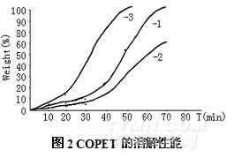 海島型超細纖維是在制成織物后把海組分溶解掉,留下島組分而形成連續(xù)不斷的超細纖維的。因此海組分的溶解性能對經(jīng)編麂皮絨的效果是致關(guān)重要的。COPET在水中的溶解符合先溶脹后溶解的規(guī)律。COPET的組成、結(jié)構(gòu)、分子量及外部條件均對溶解有一定的影響,外部條件對COPET的溶解的影響如圖2所示。曲線1為水溶性聚酯在95℃的熱水中的溶解行為它先以溶脹為主,當(dāng)達到一定溶解度后,則以溶解為主;曲線2為水溶性聚酯在95℃下,0.5%NaOH水溶液中的溶解情況,它也是有一個溶脹溶解過程,但溶脹較慢,溶解最后還有殘留物,這可能是由于Na+、OH―離子的存在,破壞了高聚物的溶解平衡,使溶解速度變得較慢,另外NaOH也與聚合物中的一些成分產(chǎn)生了反應(yīng),生成了沉淀,曲線3為水溶性聚酯在95℃下含0.5% NaOH,1l/g1227促進劑水溶液中的溶解情況,由于在水中加入了1227表面活性劑,因而,水溶性聚酯在溶脹的同時表面也發(fā)生了水解,變成了小分子而促進了水解的進行,使溶解速度加快。并且可根據(jù)不同情況調(diào)整NaOH的百分含量來控制溶解速度。