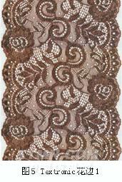 目前,采用RJWB8/2型Cliptextronic賈卡經(jīng)編機(jī)可以生產(chǎn)彈性或非彈性的,帶花環(huán)的或不帶花環(huán)的花邊。花邊底布結(jié)構(gòu)清晰,花紋精致,有立體效應(yīng),克重輕,成本低。這類產(chǎn)品在高檔婦女內(nèi)衣中應(yīng)用廣泛。Cliptextronic花邊如圖4所示。