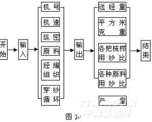 以上述理論為基礎(chǔ)進(jìn)行了編程,程序運(yùn)行在windows98下,采用了VB5.0這種高效、簡單的編程語言,程序框圖如圖2所示。因計(jì)算機(jī)輔助經(jīng)編工藝計(jì)算是經(jīng)編織物CAD系統(tǒng)的一個(gè)程序,關(guān)于經(jīng)編組織以及穿經(jīng)循壞的數(shù)學(xué)模型等由于篇幅有限,這里不再描述。