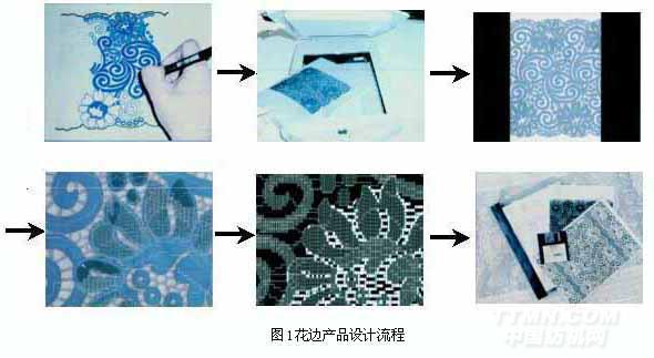 CAD軟件的使用,改變了設(shè)計人員的工作模式,大大提高了生產(chǎn)效率。圖1 顯示了多梳花邊設(shè)計的過程。設(shè)計人員首先畫出花紋小樣,然后通過掃描儀把花紋圖案轉(zhuǎn)移到計算機(jī)中,通過CAD系統(tǒng)進(jìn)行梳櫛分配及原料選擇,然后自動確定各把梳櫛的墊紗運(yùn)動,從而可以確定各把梳櫛所使用的鏈塊。利用CAD系統(tǒng)不僅可以進(jìn)行花紋設(shè)計,進(jìn)行織物效應(yīng)仿真,還可以記錄各項(xiàng)數(shù)據(jù),并把這些數(shù)據(jù)保存到軟盤上,直接用于對經(jīng)編機(jī)的控制。