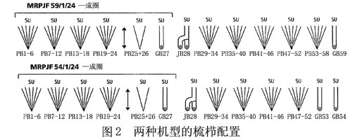 新型的Textronic花邊機(jī),被命名為MRPJF59/1/24,它與前一種機(jī)型MRPJF53/1/24相比,最大的不同之處在于花梳的數(shù)目增加了(增加至56把),因而浮雕花型的花邊效果得到了優(yōu)化,在立體花邊領(lǐng)域里這是最完善的。匹艾洲電子賈卡系統(tǒng)系統(tǒng)的使用,改進(jìn)和完善了機(jī)器的操作和維修。如果把MRPJ59/1/24多梳經(jīng)編機(jī)新增加的六把梳櫛換成1把地梳,則變成MRPJ54/1/24多梳經(jīng)編機(jī),如圖2所示。它能生產(chǎn)兩種新型的花邊織物。