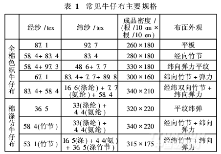 表1列出了常見的全棉色織牛仔布和棉/滌仿牛