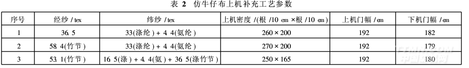 為便于比較兩類(lèi)產(chǎn)品的特點(diǎn),表1僅給出部分坯布參數(shù)。實(shí)際上,在新品開(kāi)發(fā)過(guò)程中,坯布上機(jī)的許多參數(shù)都是非常重要的,仿牛仔布的相關(guān)上機(jī)工藝參數(shù)補(bǔ)充見(jiàn)表2。