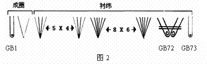 帶壓電賈卡系統(tǒng)的MRPJ73/1多梳機具有緊密性、可靠性和清潔性等特點。賈卡梳櫛的兩面均具有壓電陶瓷條。當受電流脈沖作用時,相應(yīng)的賈卡導紗針從釋放的位置實現(xiàn)側(cè)向移動。這樣不需要任何機械控制,利用電子脈沖,每一賈卡導紗針都可以被單獨選針。壓電賈卡梳櫛位于地梳櫛和花梳櫛之后,處于倒數(shù)第二的位置上。在織物表面使用襯緯紗線和勾邊紗線可以得到清晰的三維立體花紋。這種機型總共有73把梳櫛,如圖2所示,其中位置1是1把地梳櫛,70把花梳櫛(GB2~GB71),位置72上是一把單獨的壓電賈卡梳櫛,位置73上是一把彈性紗梳櫛。這些梳櫛被分為18個橫移組,其中2個橫移組可以形成線圈。梳櫛的橫移是由2個帶有微處理器的數(shù)字式起花裝置控制的,它位于機器的左右兩側(cè)。其中位于機器右邊的微處理器控制地梳櫛,壓電賈卡梳櫛和所有從GB4開始的偶數(shù)號提花梳櫛;而位于機器左邊的微處理器則控制從GB5開始的奇數(shù)號提花梳櫛。控制梳櫛GB2和GB3的機械墊紗機構(gòu)位于機器的左側(cè)。由—個單針插入式的復合針床、一個針芯床、一個移動式的握持沉降片床和一個柵狀脫圈板所組成的成圈機件由浸于一封閉油浴中的偏心盤式的曲柄傳動機構(gòu)連續(xù)傳動。紗線置于5×533mm(21″)的分立式經(jīng)軸架上和放置70根花經(jīng)軸的花經(jīng)軸架上。喂紗裝置由控制地梳櫛、壓電賈卡梳櫛(GB72)和彈性梳櫛(GB73)的3個EBA電子送經(jīng)裝置組成。為了保證更長的運行時間,使用2根經(jīng)軸共同為壓電賈梳櫛送經(jīng)。壓電賈卡梳櫛的紗線由分段經(jīng)軸通過張力彈簧系統(tǒng)(平衡彈簧)控制送紗。
