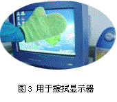 超細(xì)纖維清潔用織物 對(duì)去除指紋、手垢、淀粉類和其它水溶性物質(zhì)等污物有較好的效果。 包括高效清潔巾、清潔手套、手機(jī)擦巾等。該織物去污能力特別強(qiáng)、手感非常柔軟、多次水洗不會(huì)變硬、不抽絲、不脫圈,耐用性為普通清潔物的 4 倍以上。主要用于擦拭轎車、飛機(jī)、眼鏡、顯示器(如圖 3 )、精密儀器、玻璃、水晶制品、皮革制品、高檔服裝、家電、家具等。去污塵不留痕跡,保護(hù)漆面、電鍍、玻璃面、鏡頭。使用后即可用水沖洗,毛巾上的污漬極易去除,油污嚴(yán)重時(shí),只用少許香皂或洗衣粉就洗得一干二凈。
