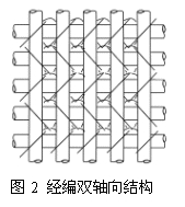 雙軸向經(jīng)編織物結(jié)構(gòu)如圖2所示,由緯紗、經(jīng)紗和成圈紗組成。經(jīng)紗處于緯紗和成圈紗延展線之間。