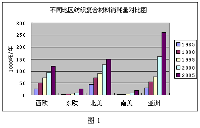 紡織復(fù)合材料通常由一種基質(zhì)材料與一種增強(qiáng)織物復(fù)合而成。它既保留了復(fù)合前各組成材料的優(yōu)點(diǎn),又具有其各組成成分所不具有的新的性能,是一種新穎的工程材料,具有極大的發(fā)展空間,這一點(diǎn)可從紡織復(fù)合材料的消耗量圖表得到證實(圖 1)。