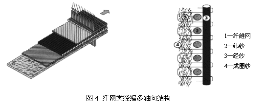 圖4為帶有纖維網(wǎng)的多軸向織物。 在經(jīng)編結(jié)構(gòu)中可織入預(yù)先粘合的纖維網(wǎng),這種經(jīng)編增強(qiáng)結(jié)構(gòu)具有很更廣泛的用途。例如,在易于沉陷區(qū)域和滑坡區(qū)域修建安全區(qū),纖維網(wǎng)可防止泥土和碎石的泄漏或滑坡。
