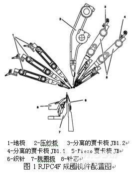 RJPC 4F 賈卡經(jīng)編機(jī)由地梳( 1 )、壓紗板( 2 )、分離的賈卡梳 JB1.2 ( 3 )、分離的賈卡梳 JB1.1 ( 4 )、 Piezo 賈卡梳 JB ( 5 )、織針( 6 )、脫圈梳( 7 )和針芯( 8 )組成。該機(jī)采用復(fù)合針,并且單針插放。針芯采用 1/2 英寸寬度的針塊。采用組合式賈卡梳櫛,由兩個(gè)分離的賈卡梳 JB1.1 和 JB1.2 組合而成。所有成圈機(jī)件都由封閉油箱中凸輪或者曲柄控制。 RJPC 4F 賈卡經(jīng)編機(jī)的賈卡梳僅作橫移,不作擺動(dòng);壓紗板作上下運(yùn)動(dòng), 3 把地梳既擺動(dòng)又橫移。