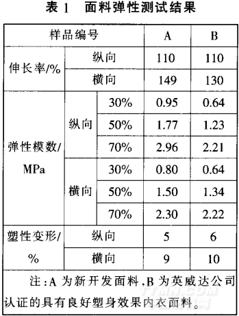 成品定形時(shí)間約53 s,該定形工藝比較成熟。因?yàn)閺娜旧蟮慕Y(jié)果來(lái)看,布面比較平整,手感、彈性均佳,無(wú)須再做特別的改進(jìn) 實(shí)際 開(kāi)發(fā)中,可根據(jù)布面的現(xiàn)場(chǎng)效果做適當(dāng)調(diào)整 但是溫度盡量不宜過(guò)高,150℃已頻臨聚酯類(lèi)氨綸的黏流態(tài),在高溫有張力并且有硅油的情況下,氨滌與錦綸的有效粘連會(huì) 遭破壞,布面彈性降低